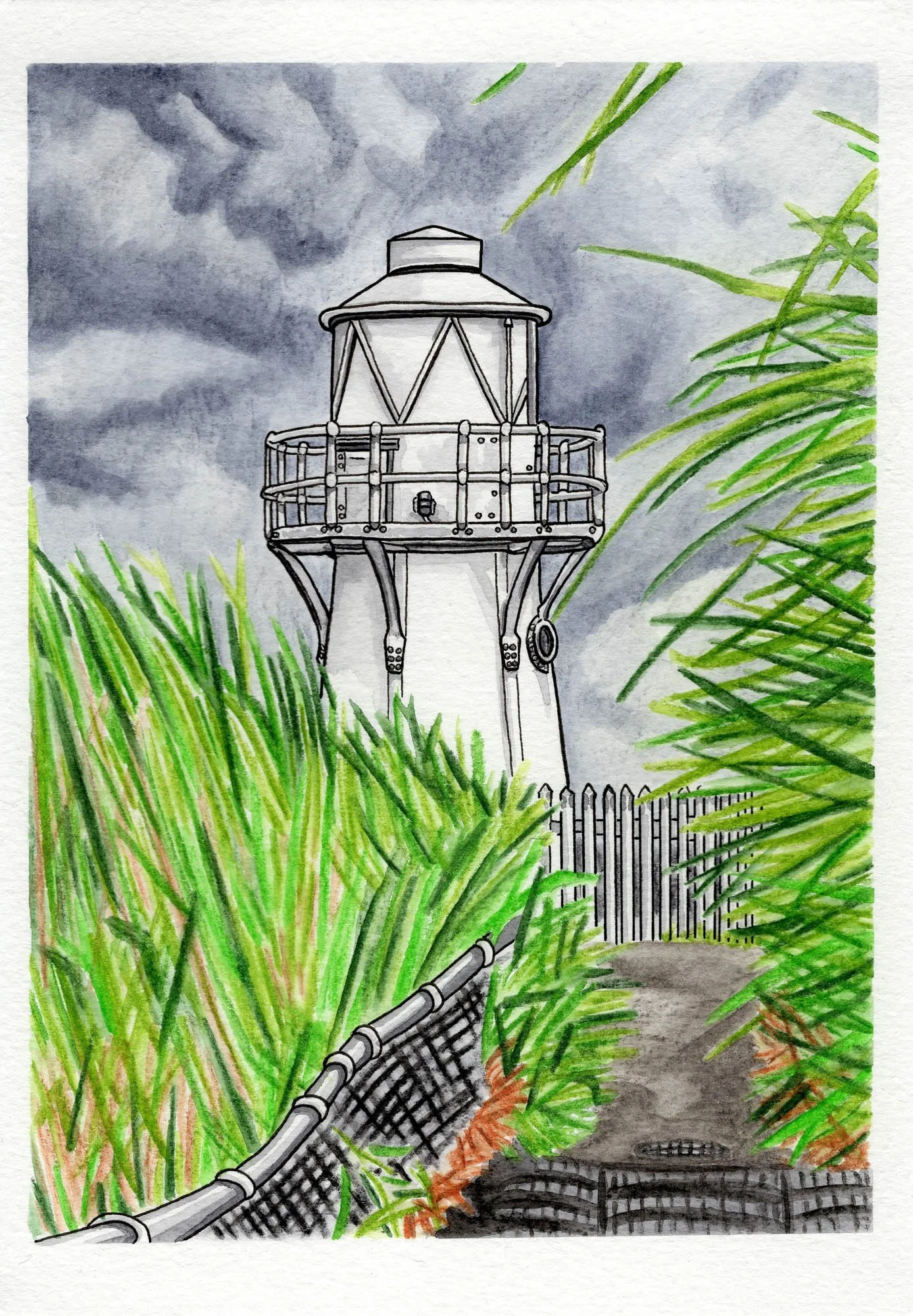 East Usk Lighthouse, Newport Wetlands: Inktense pencils and fineliners.